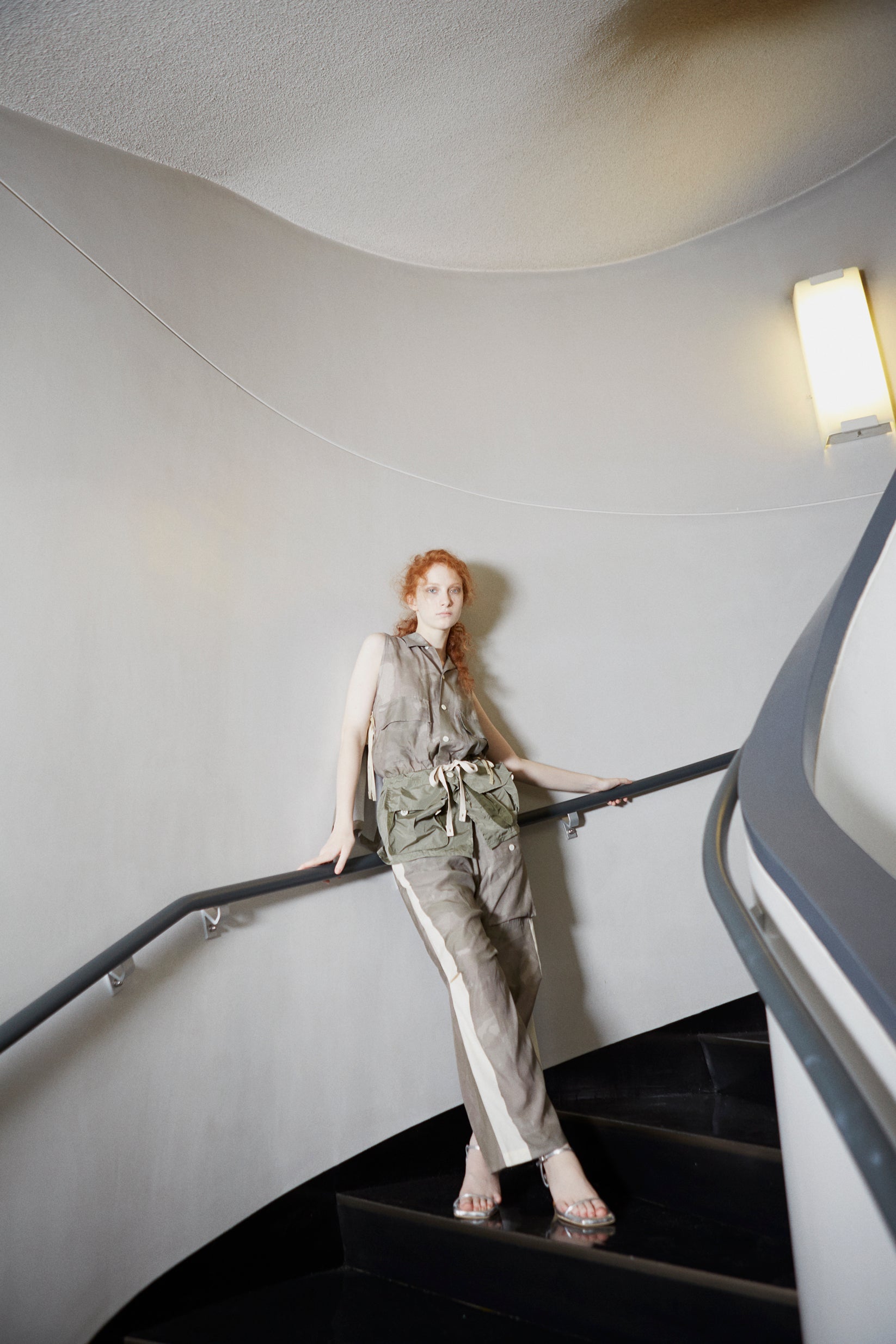 ・後ろ見頃は2重になっていて、長い丈のシャツを合わせている様に見える。共布の細ベルトも付属しているので、後ろのウェストを絞ったシルエットにも変化させられる。