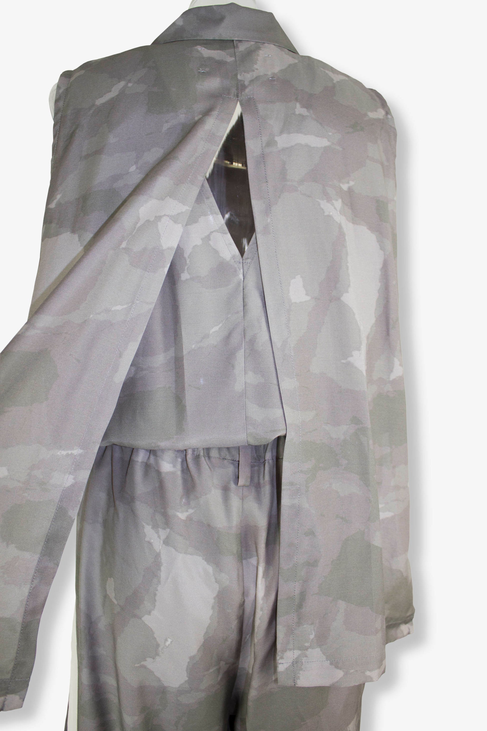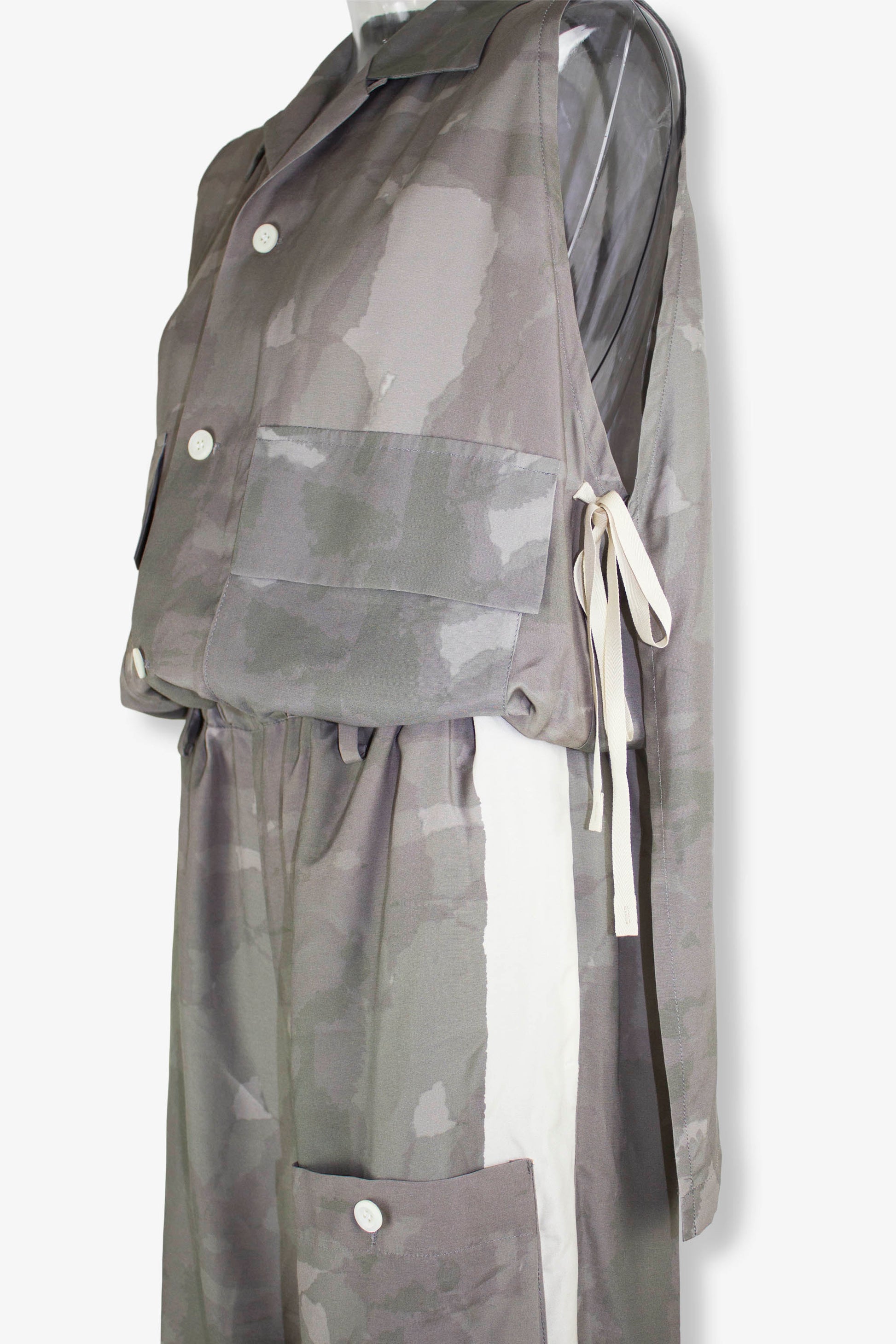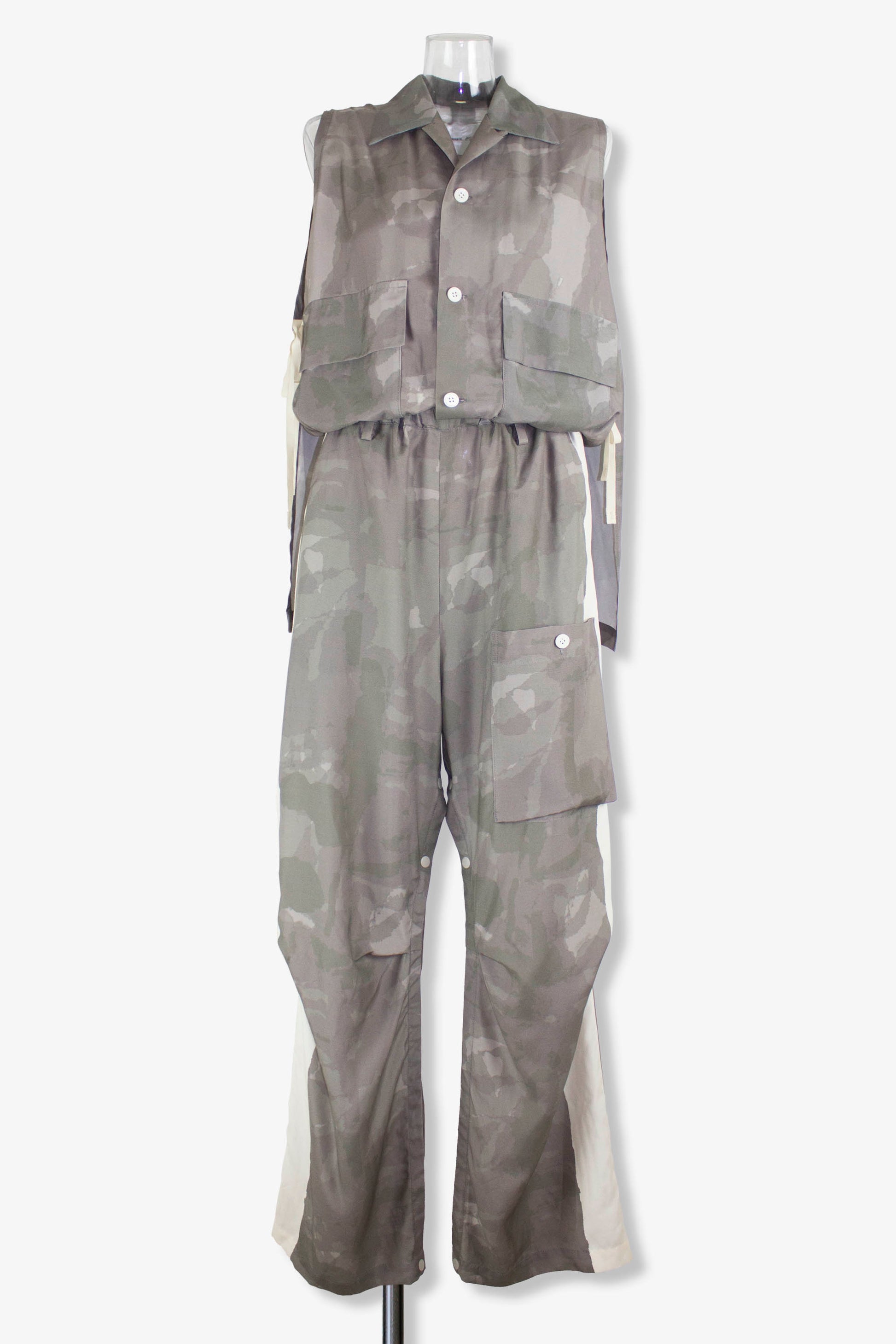 ・レーヨンアロハシャツの素材のジャンプスーツ。ミリタリーディティールを落とし込んだデザイン。