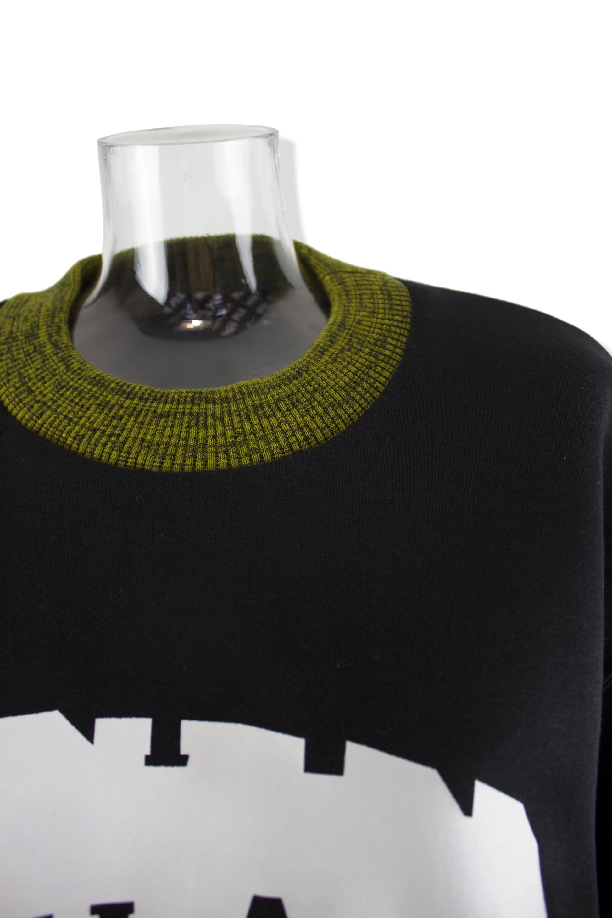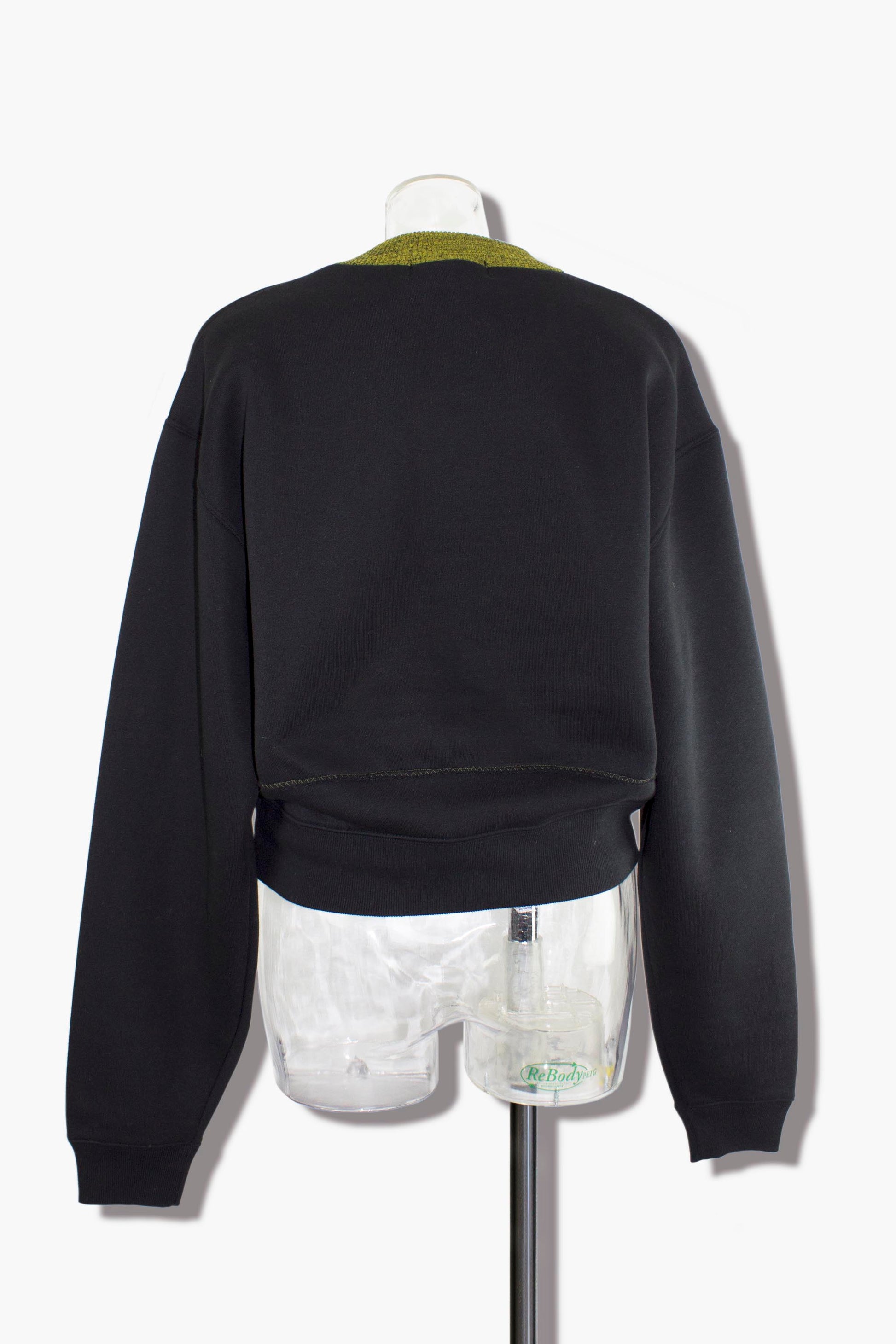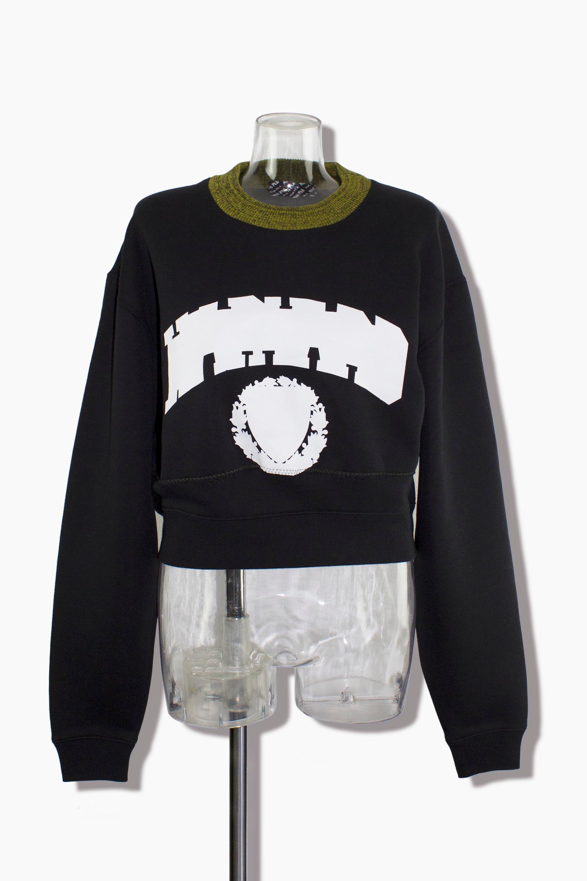 衿はイエローとブラックのメランジ糸編み上げたリブで、アクセントをプラス。フロントにはカレッジロゴをモチーフにしたプリントを落とし込み、ヴィンテージ感とモード感を融合させました。