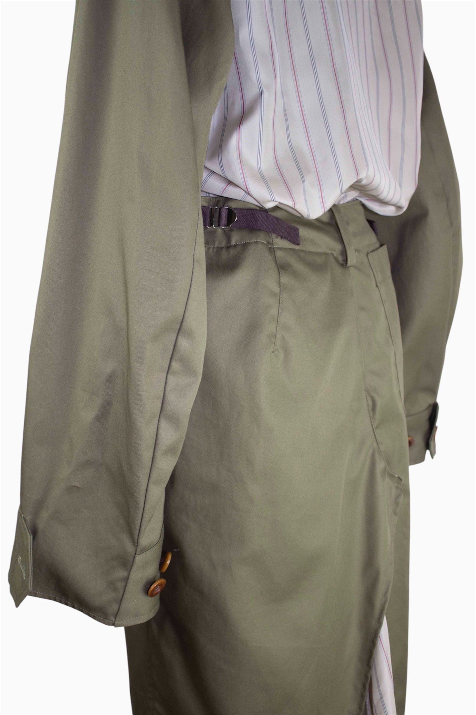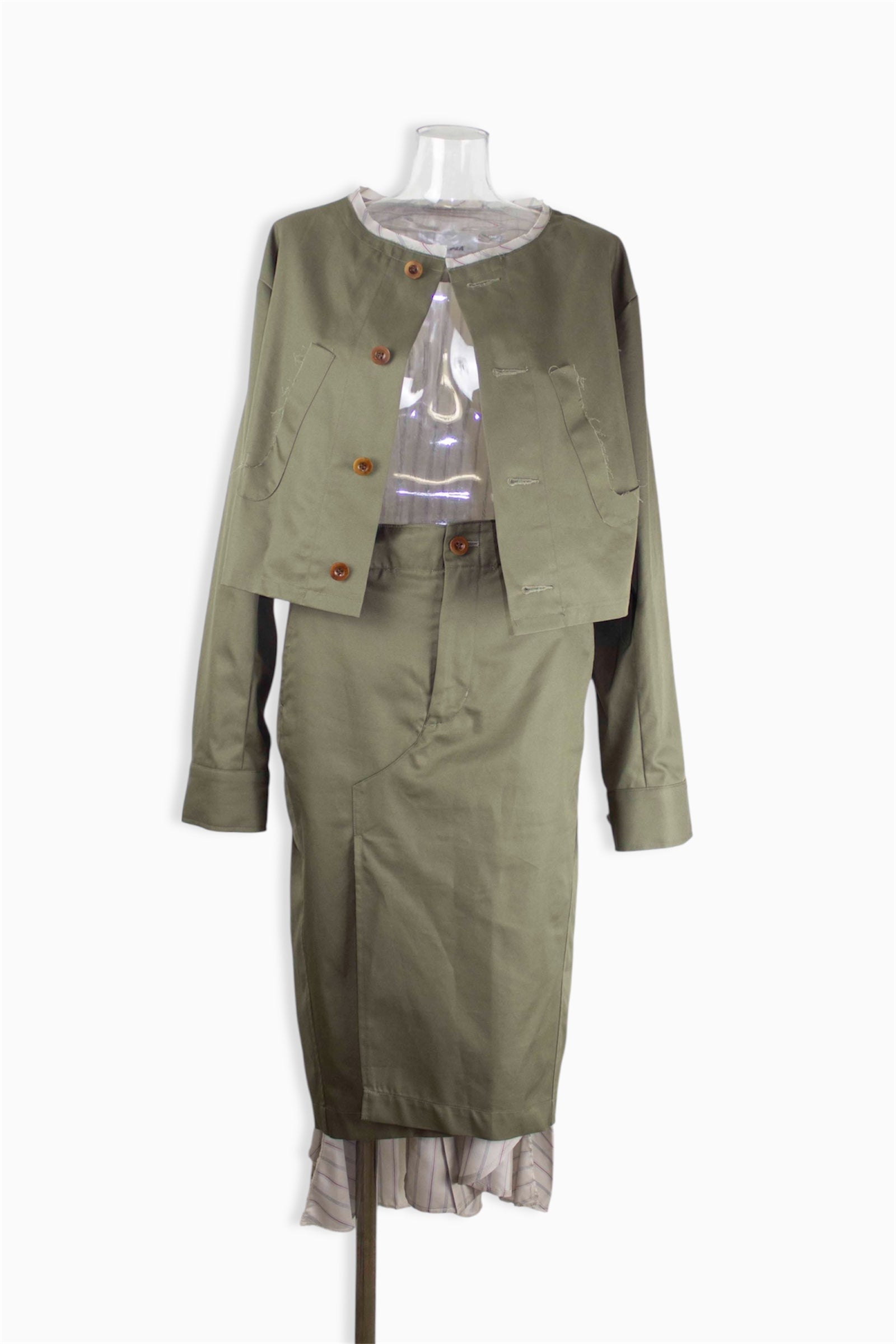 コンバットトロピカルジャケットとスカートをドッキングさせ、セットアップの枠を超えた新たなスタイルを提案します。