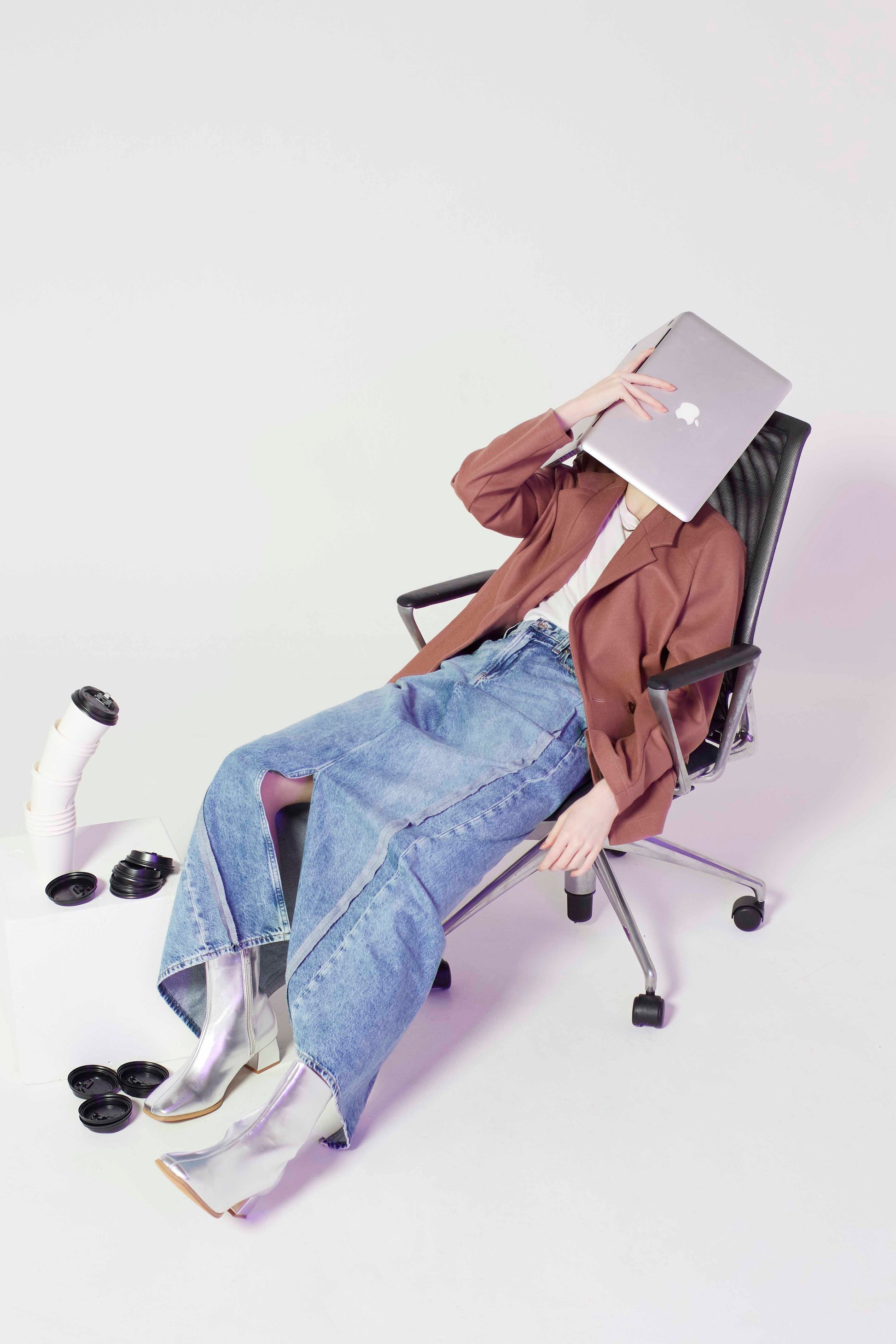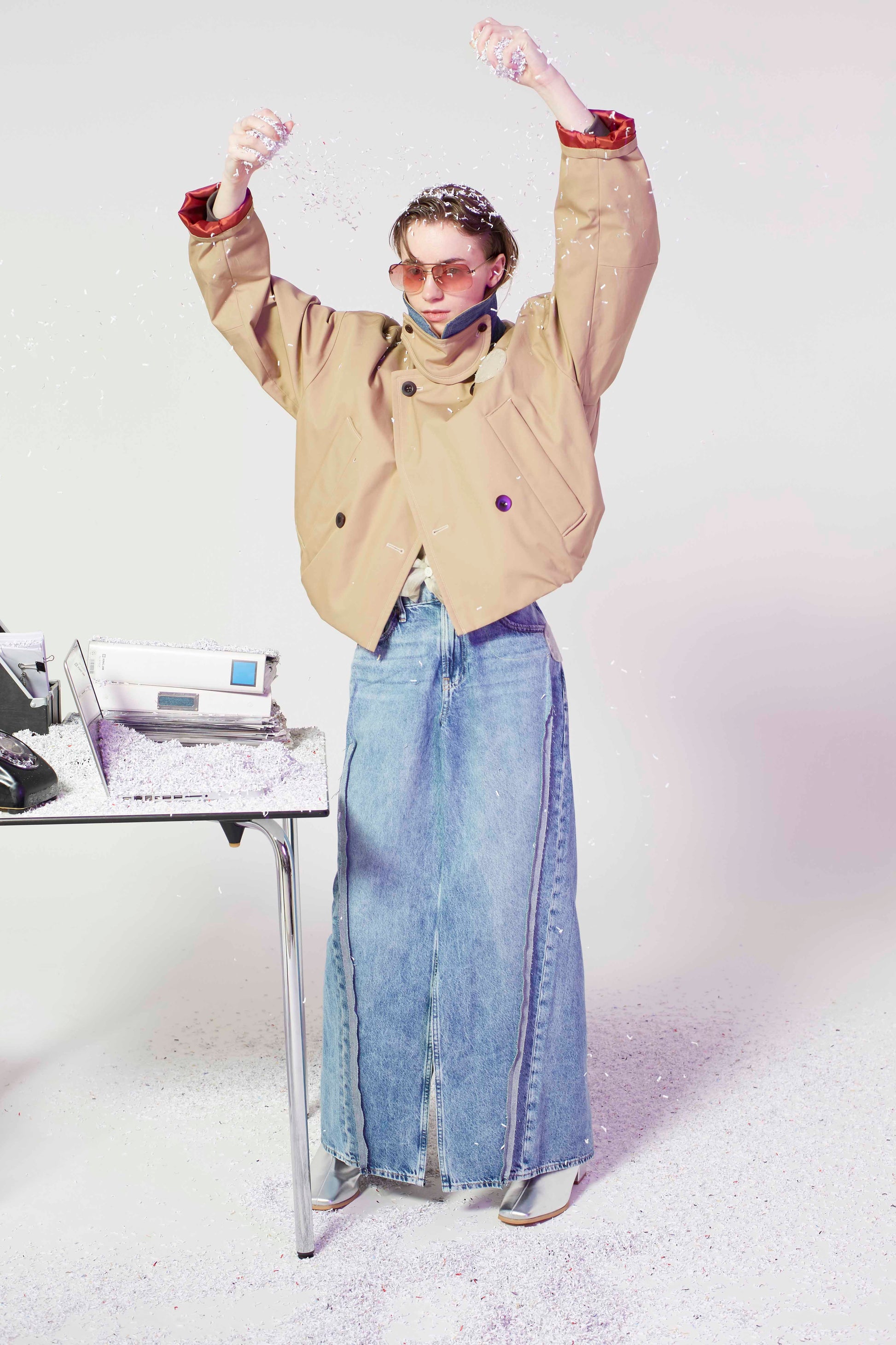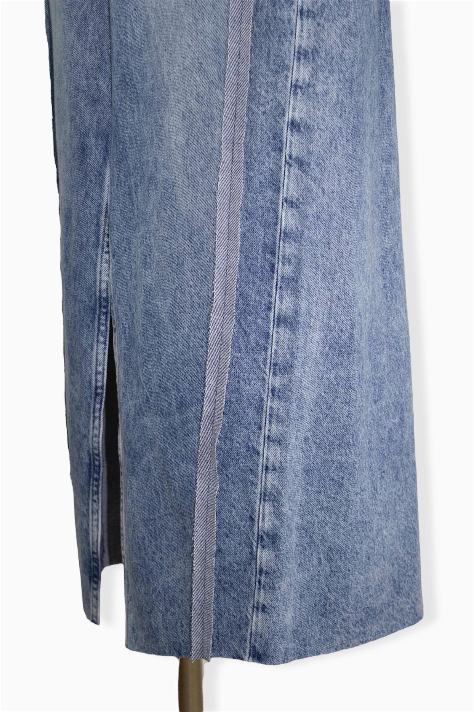オーバーサイズのジーンズを大胆にリメイクし、洗練されたシルエットへと昇華させたタイトスカート。